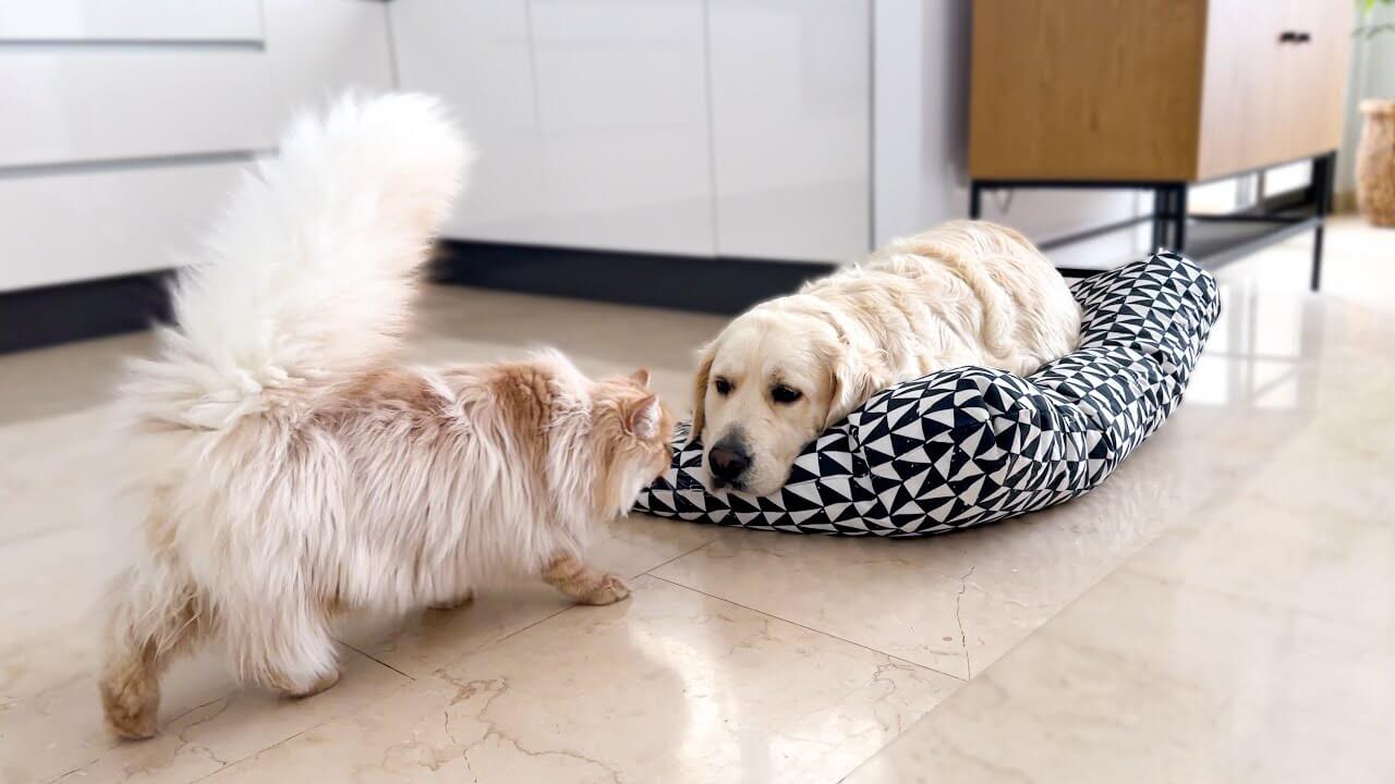 どうも猫ちゃんはワンちゃんと一緒に寝たいようなのですが、残念ながらワンちゃんは大型種のゴールデンレトリバー。