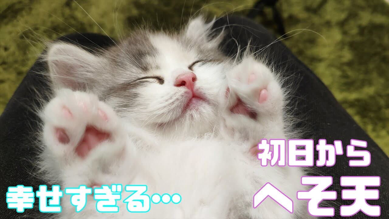 お家へ来た初日とは思えない寝姿をみせてくれる子猫
