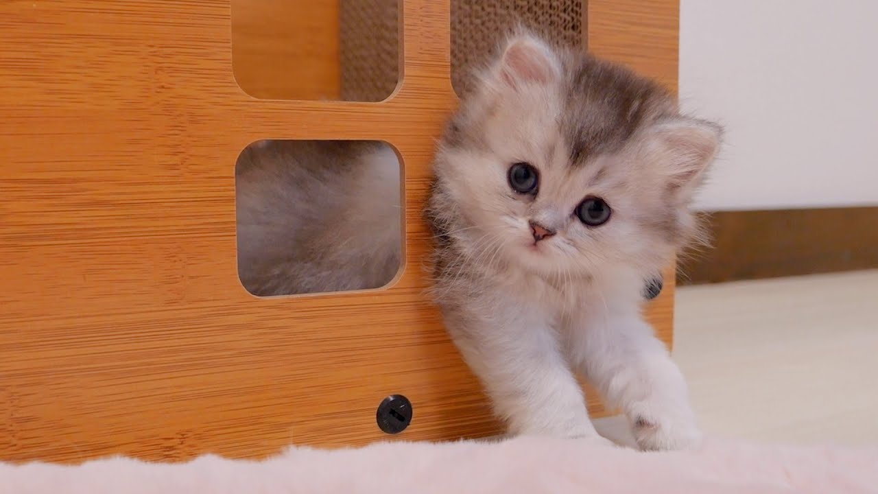 猫型のハウスのなかで子猫の兄弟同士が仲良くじゃれあって遊んでいます。