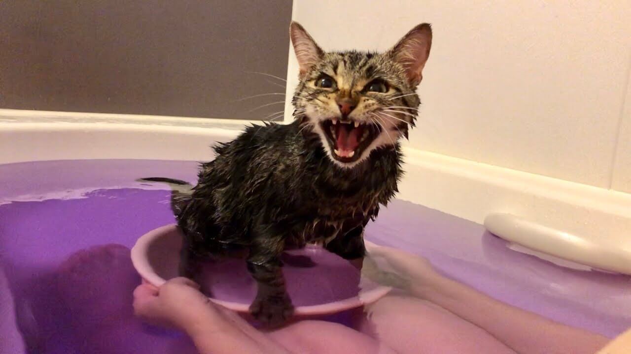 浴槽の淵に乗っかってきて入浴しているところをじっと眺めるちょりちゃんでしたが飼い主さんが、ちょうど良いのでちょりちゃんのことをお風呂に入れてあげることにしたようです。