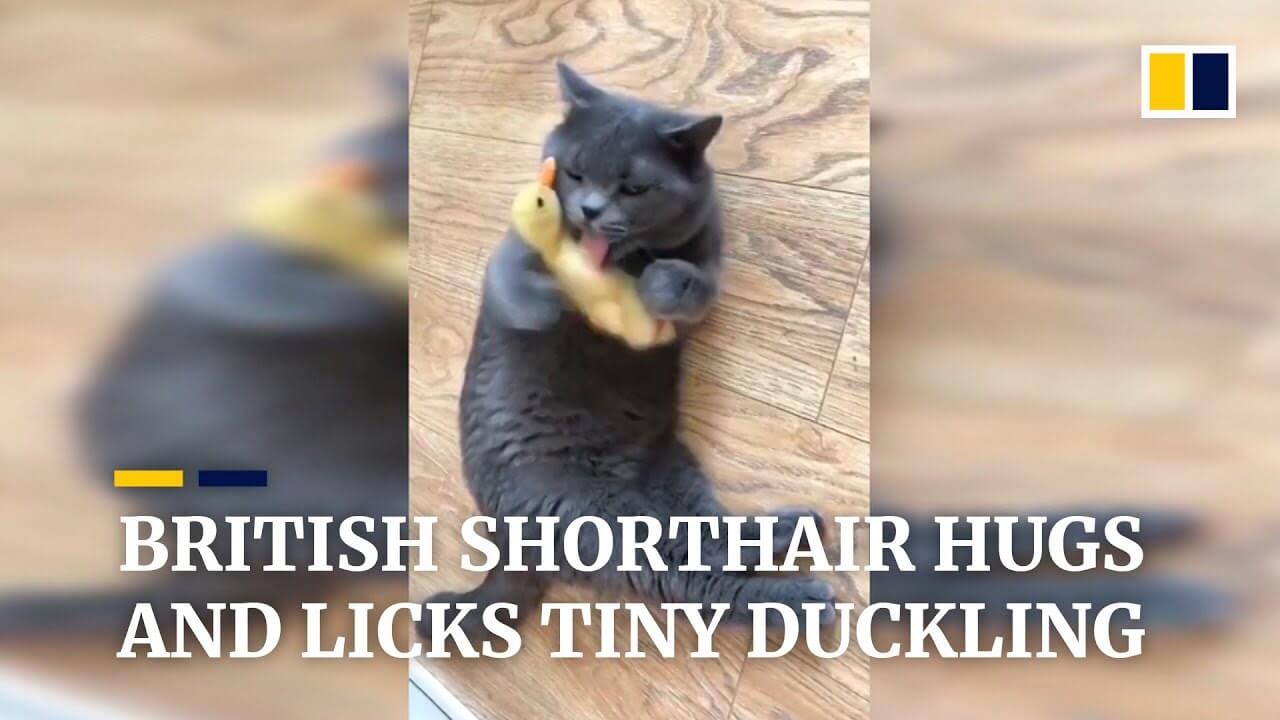 がちむちボディのブリティッシュショートヘアの猫さんが前足でぎゅうぎゅうとハグしているのはアヒルの仔です。