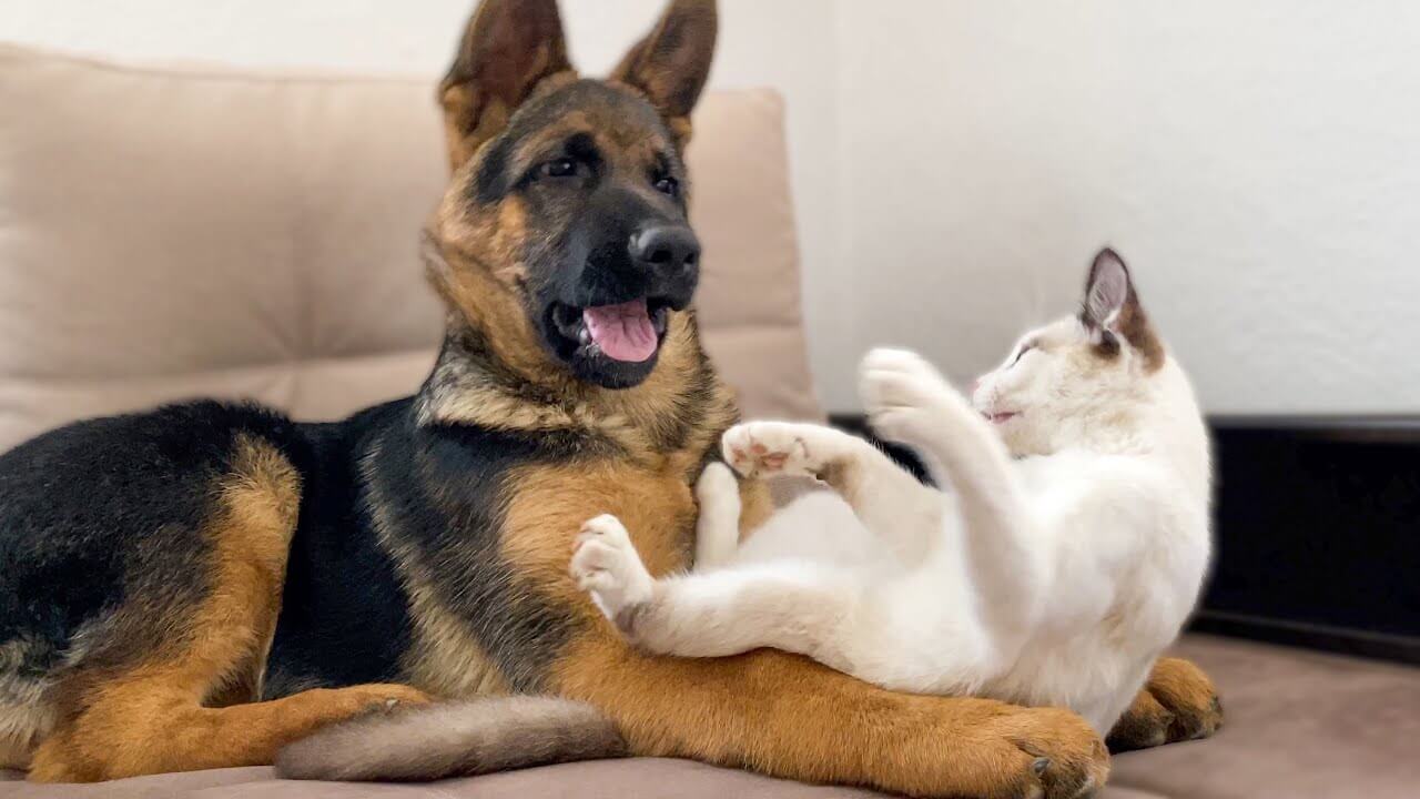 子猫の体の大きさよりもはるかに大きなシェパードの子犬ですから、力だって圧倒的に子犬のほうが強いはずです。