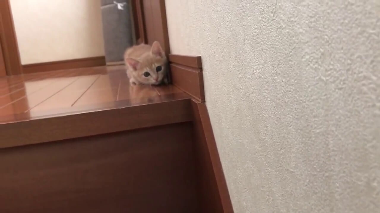 階段の上と下で子猫と一緒にだるまさんが転んだを遊んでいる。飼い主さん。子猫は階段の上からじっと頭を出したり、引っ込めたりする飼い主さんのことを見つめていました。
