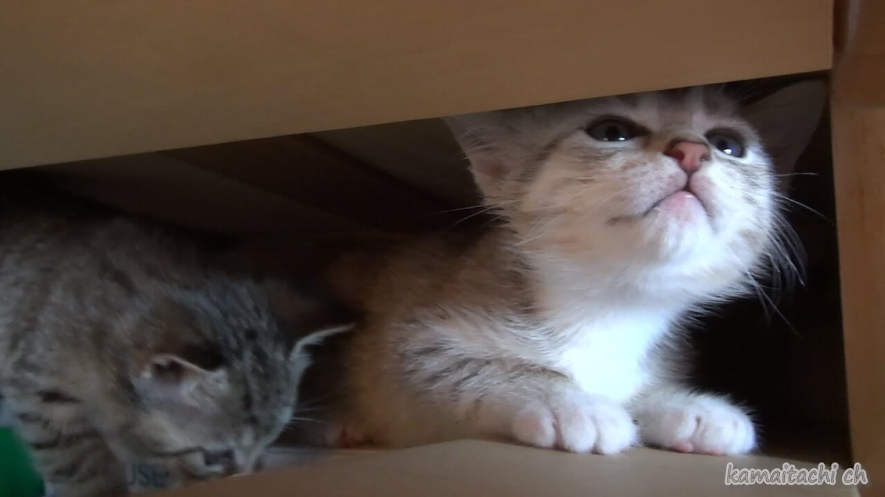 猫は狭いところを好む性質があるからか、子猫ちゃん達も机下の収納はとても居心地が良い模様。