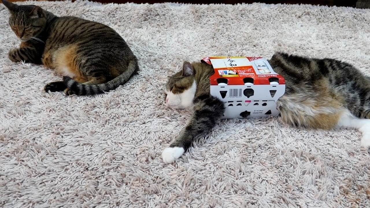 ラグの上でくつろいでいるはなちゃんの前にビールの空箱を置いてみます。
