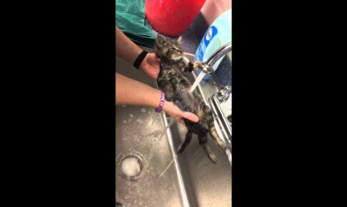 キジトラの子猫が飼い主さんの両手で仰向けになった状態で支えられたままで、水道の蛇口のしたで左右に体を動かし往復しています。