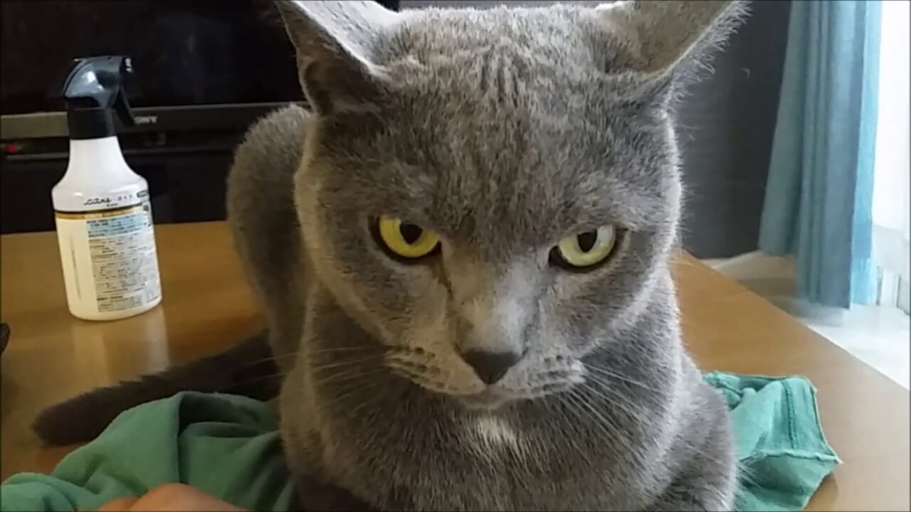 あまりにしつこくシャツを取り返そうとしたので、猫さんの耳はぺたんと倒れ気味になり、鼻の横もぷっくり膨らんで、激オコ状態になってしまいました。