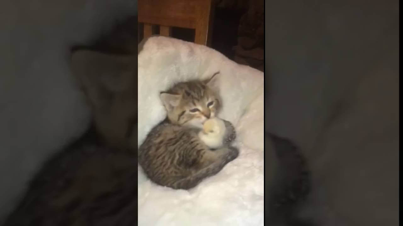 ベッドの中で子猫が自分よりももっともっと小さなひよこ、その腕の中に抱いて静かに昼寝しています。