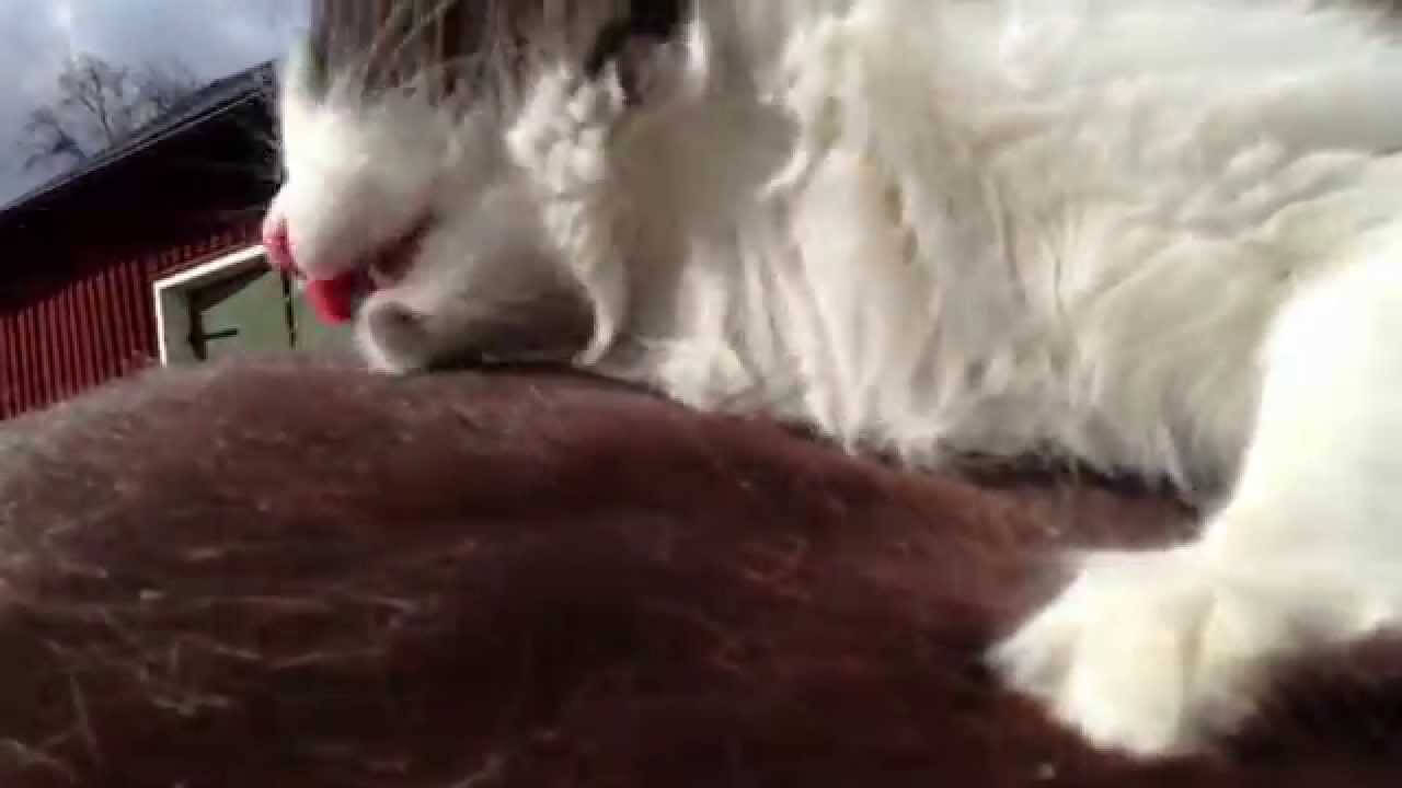 馬小屋から日向ぼっこに出てきた馬の背中の上に牧場の猫が乗っかっていて、背中の上でごろごろと気持ちよさそうに体を擦り付けています。