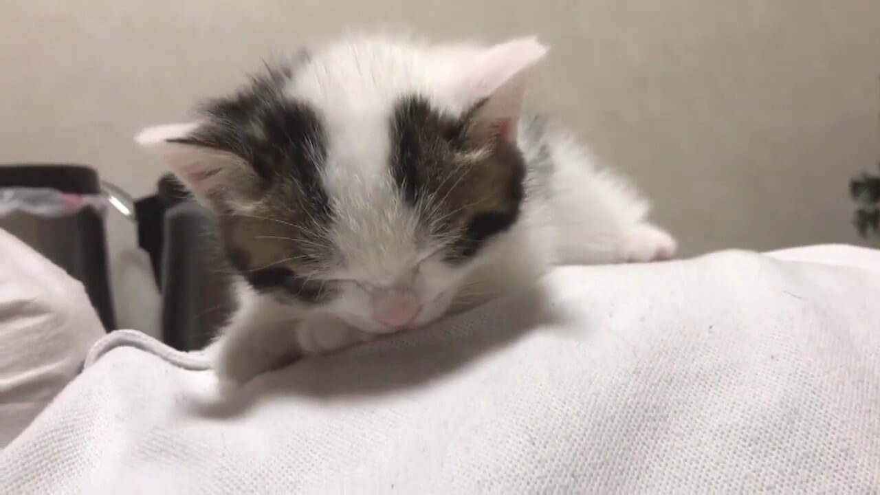 優しいお兄ちゃんが豆大福をすくいあげて、お腹の上に乗せてあげると、何度か寝る位置を調整してゴソゴソしていたらようやく寝る位置が決まり、そこで寝ることができました。