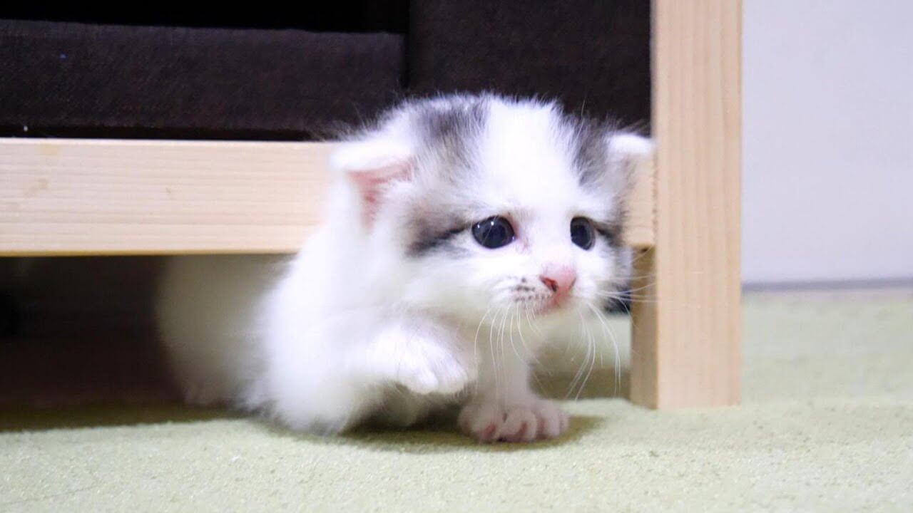 家具の下に潜って遊んでいた子猫が、勢いよく外に飛び出してきました。どうやらミルクの匂いに気づいたようです。
