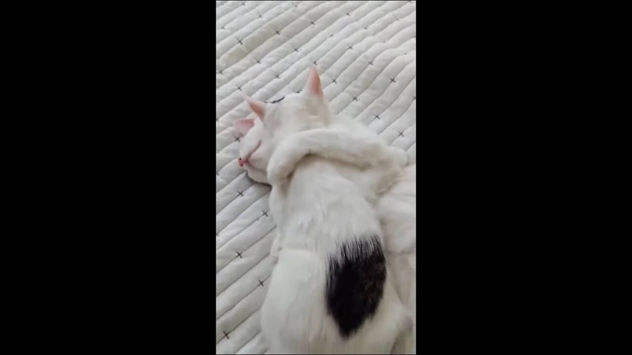両前足を背中へ回し、まるで恋人のように眠る様子をご覧ください。