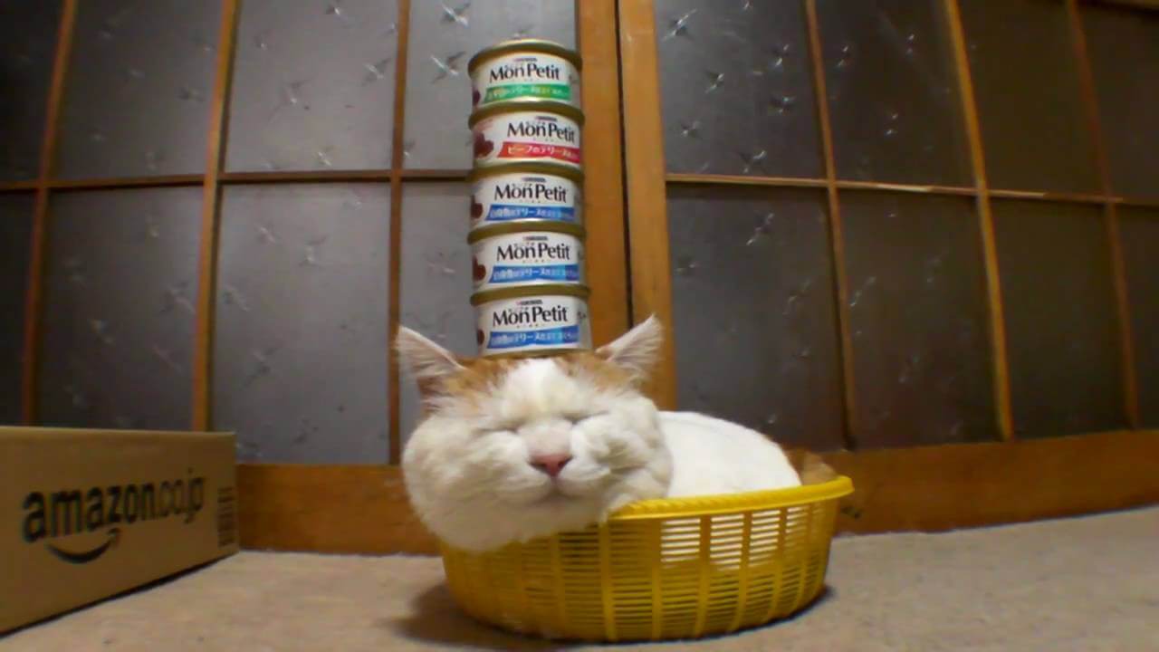 最終的には頭の上に五個ものモンプチが乗せられ、もはやタワーのようになっていました。