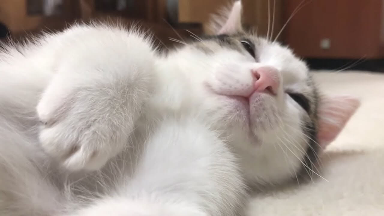 子猫の豆大福があおむけになって超リラックスしています。飼い主さんに撫でもらって相当気持ちよくなっているようです。