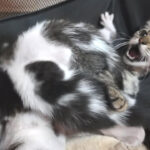 お母さんからの教えてすっかり安心した子猫たちは、早速シェパードの大きな体の上によじ登って遊び始めました。