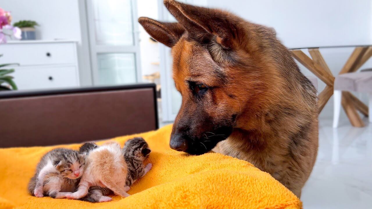 今回ご紹介するのは赤ちゃん猫を見守るジャーマンシェパードのワンちゃんです。