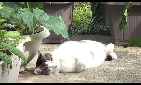 飼い猫の野良が庭の真ん中でごろんと寝転び気持ちよさそうにお昼寝しています。心地よい風が通り抜ける庭でのお昼寝タイムはとても贅沢ですね。