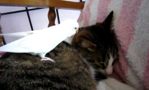 真っ白なインコが寝ている猫さんのそばで何か悪巧みをしているようです。