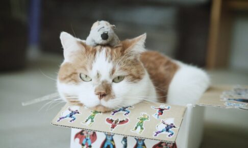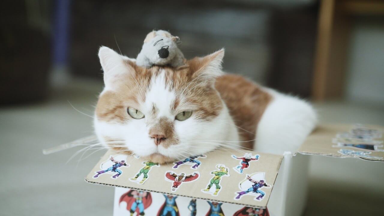 小さな段ボールの箱のなかにぎゅうぎゅうになりながらも入り込んでまったりしていたどんこですが、頭の上にネズミを乗っけて得意そうな顔で出迎えてくれました。