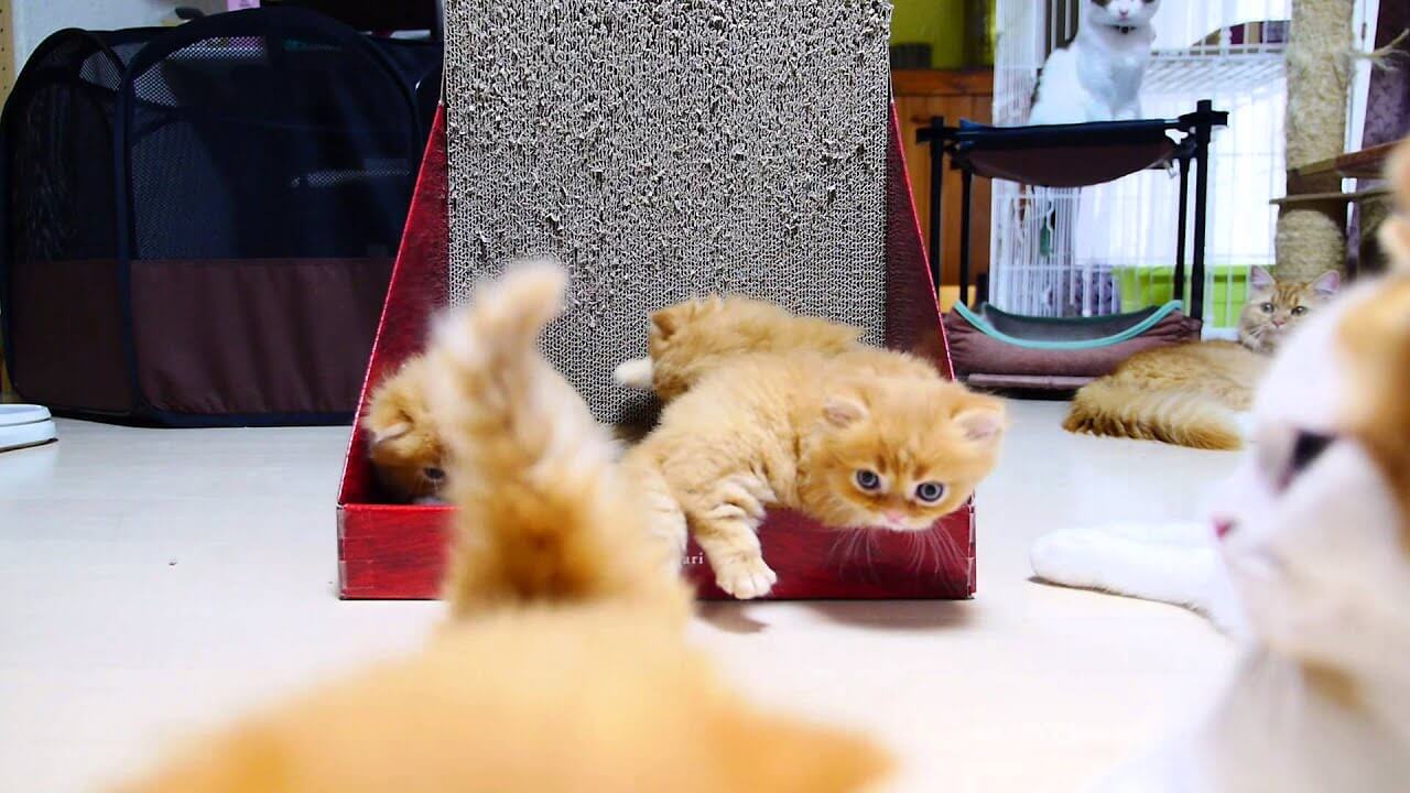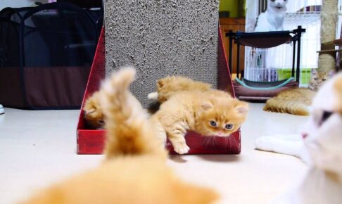 箱からすぐに出て行ってしまう元気な子猫達の動画