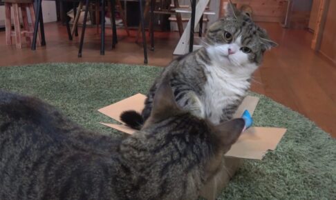 実は、箱の中でマタタビの香りを堪能しているようです。キッカーのなかに仕込まれたまたたびに夢中なまるちゃん。普段はクールなまるちゃんですが、またたびには目がないようですね。