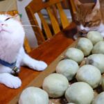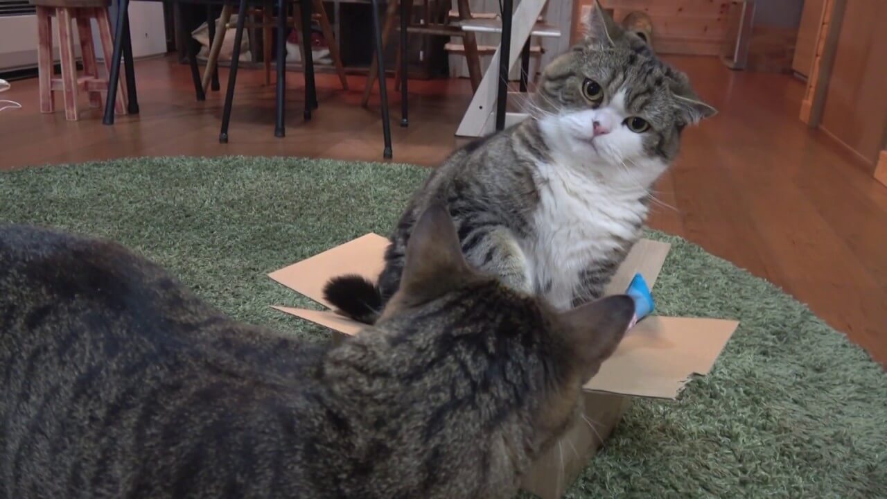早く代わってにゃ!怒りの鉄拳に、まるちゃんも何するにゃ!と反撃しています。またたびに酔っているからか、まるちゃんもかなり強気になっている様子です。