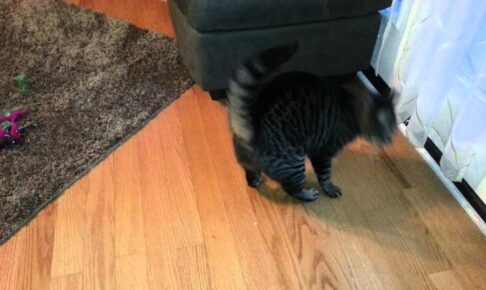 キジトラ猫さんは、体も大きいのでソファのしたに入ることはできず、すぐに諦めます。