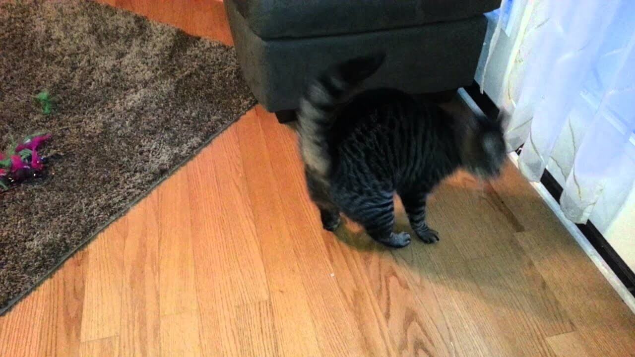 すぐにおチビを追いかけますが、すばしっこい子猫はすぐにソファの下に潜り込んで隠れてしまいます。