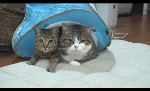 水色のテントが新しいおもちゃとして導入されました。これが猫たちに大ヒット!はなちゃんはテントの中に入ったままで、ゴロンゴロンと転がったりするほど大ハッスル!