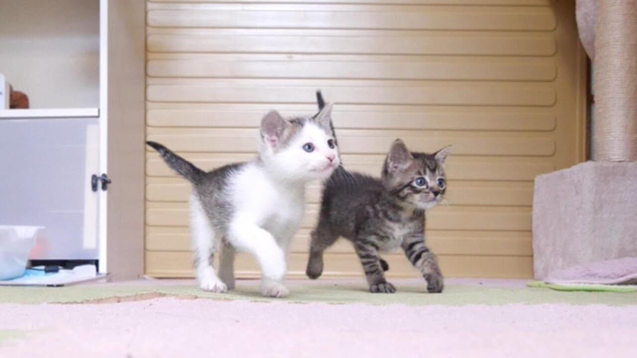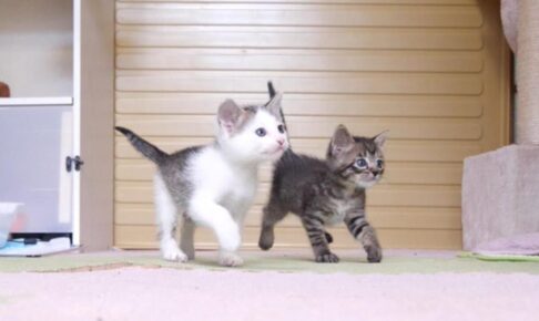 お父さんの手に寄りかかって立ち上がる子猫が可愛すぎてお父さんもニヤニヤしていることでしょう。3匹が一斉に鳴くとそれぞれの声の音程も違うのでちょうど良い加減のハモりになります。
