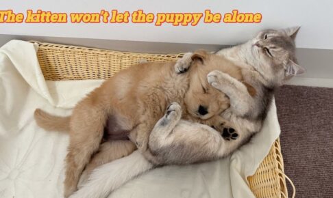 子猫は仔犬の体重がずっしりときていますが、こうやって一緒に体をくっつけていることのほうが心地よいので少々の重さは我慢しているようですね。