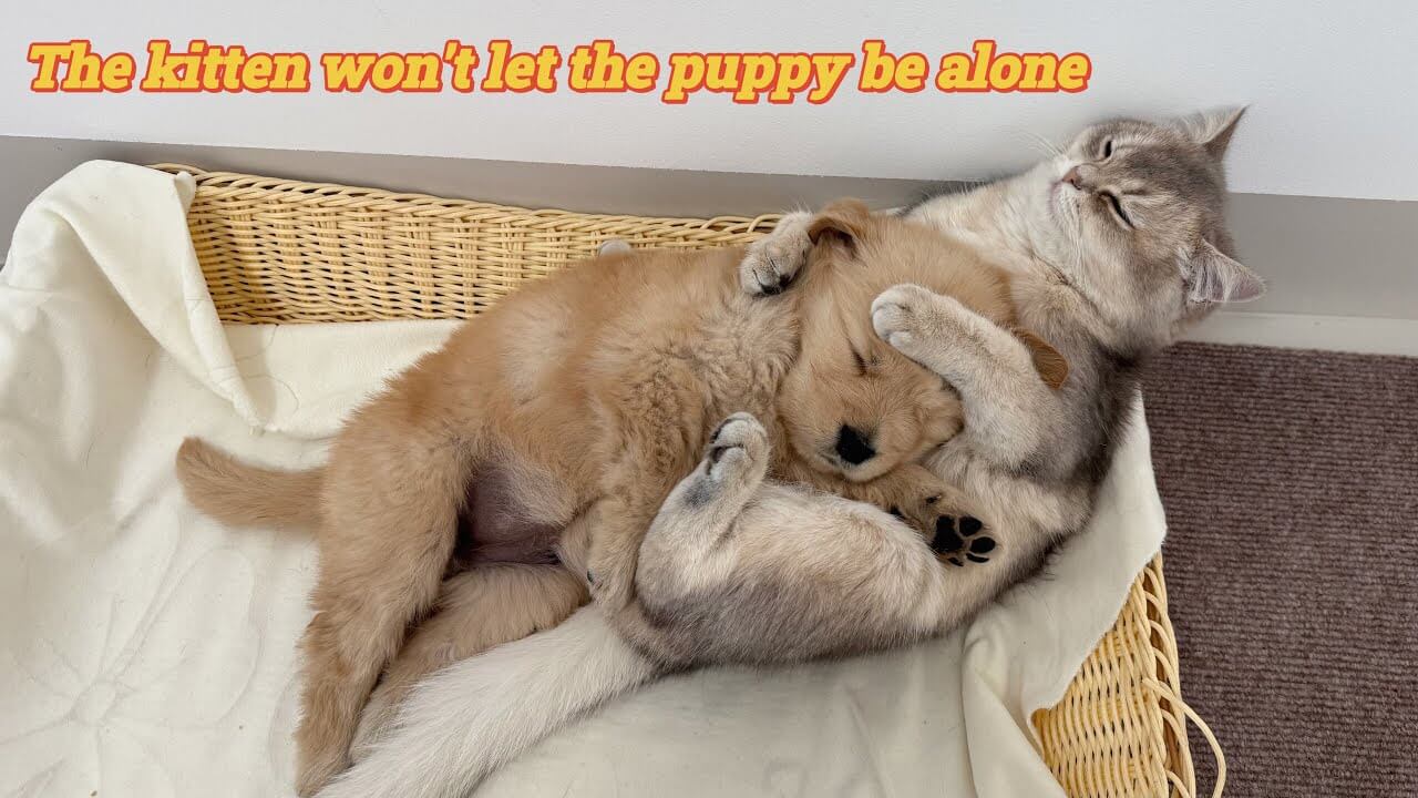 子猫が子犬を抱き抱えるようにして狭いベッドの中に一緒に入っています。仔犬はすでに子猫の腕の中でぐっすりと安眠中のようです。