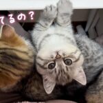 子猫のほうがしっかりしているので、仔犬のお世話係として遊び相手になってあげているようです。