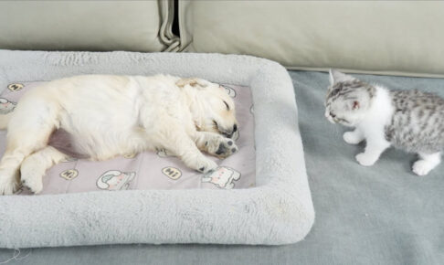 ゴールデンレトリバーの仔犬がベッドで寝ているところへ子猫がやってきました。仔犬のベッドの匂いをしきりにクンクンと嗅いでいると、仔犬も昼寝の途中で目を覚ましてしまいました。