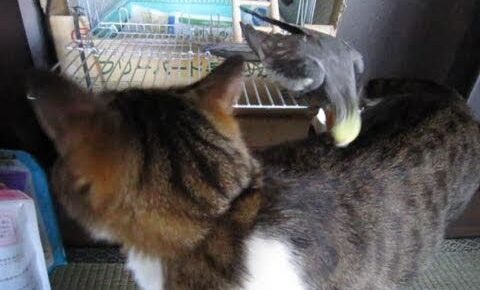 主さんの頭の上にとまっていた別のインコのうーちゃんが、猫をつっついているおかちゃんに対して、痛いよ!と注意をしているのが可笑しいですね。