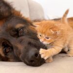 猫の背中をくちばしで突っつくインコに別のインコが注意します