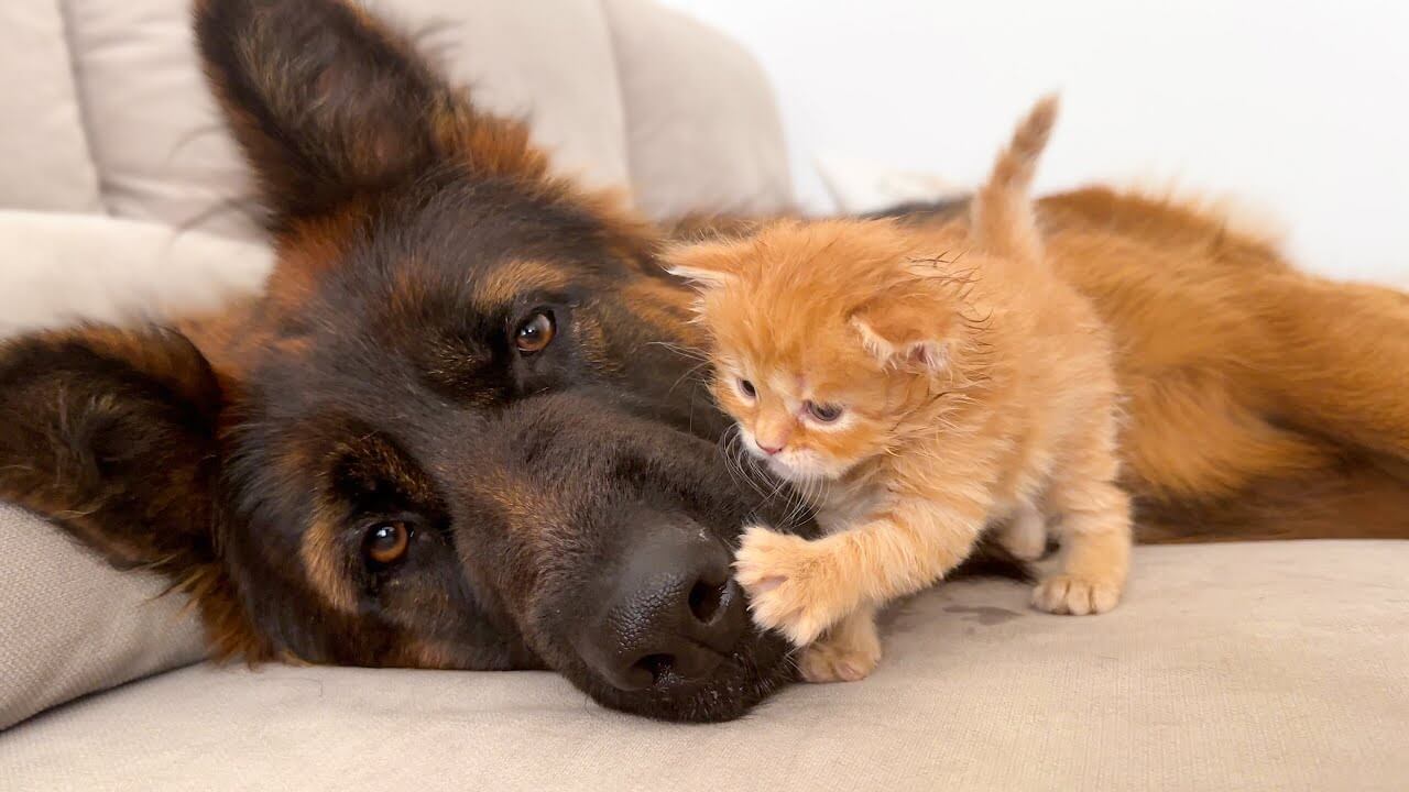 親代わりになったシェパード犬の深い愛情に包まれてすくすく成長する子猫