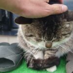 首輪をつけているのでどこかのお家の飼い猫さんのようです。指を伸ばすと、すぐに鼻先を近づけてきて挨拶をしてくれました。