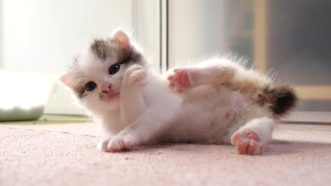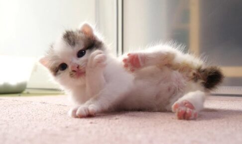 ポンポコリンなお腹をさらけだして、まったりしている子猫が自分の手を上手に毛づくろいしています。圧倒的な可愛さにニヤニヤしてしまいます。