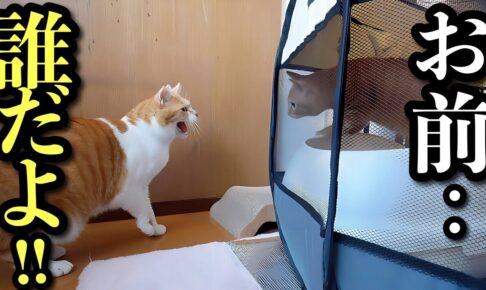 子猫部屋にやってきたチャチャが、むぎちゃんを見つけるといきなり怖い顔をしてシャー!と威嚇します。