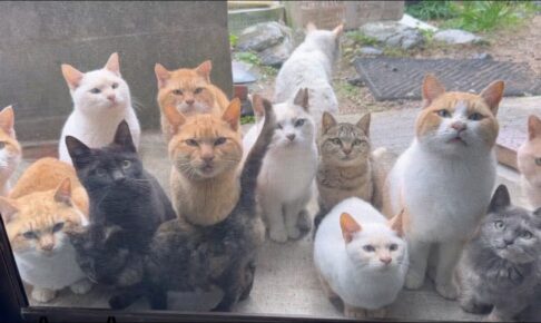 猫島の猫さんたちのごはん待ちのワクワク顔が窓の外に並んでいます