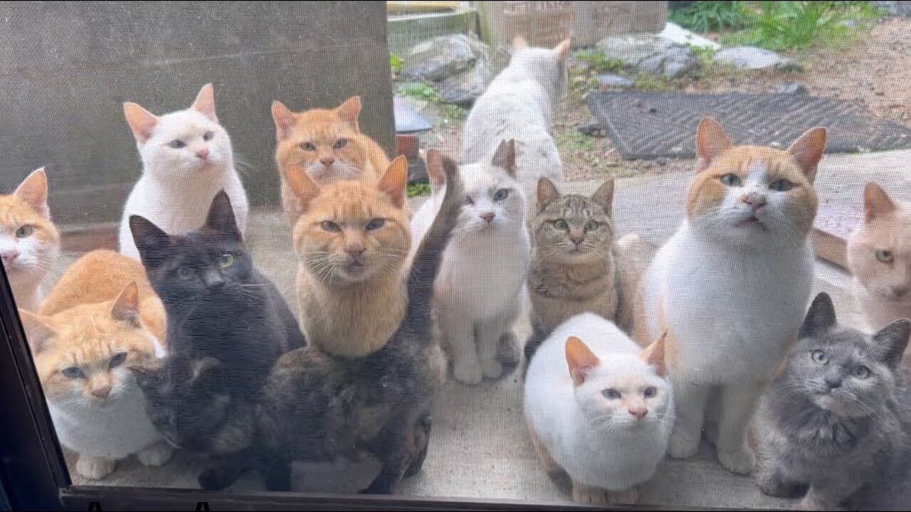 大きな窓の前には、見えるだけでも10匹以上の猫さんたちがいます。みんなお腹ぺこぺこで、ごはんが出てくるのを今か今かと待っています。