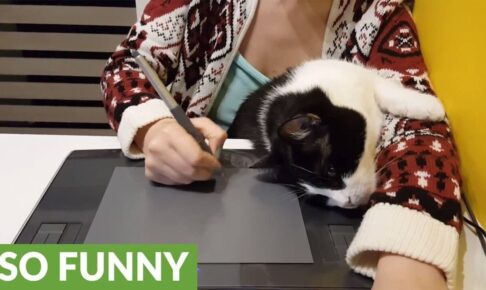 仕事に集中している飼い主さんの顔を時々見上げてくる猫さんは、愛情たっぷりの視線を送ってきます。