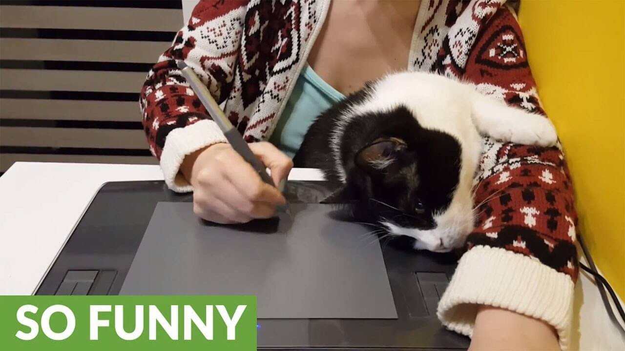 左腕は猫さんががっちりホールドしているので飼い主さんも身動きが取れませんが、とりあえず右手だけは使えるので仕事をするには差し支えないようです。
