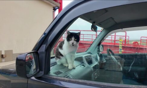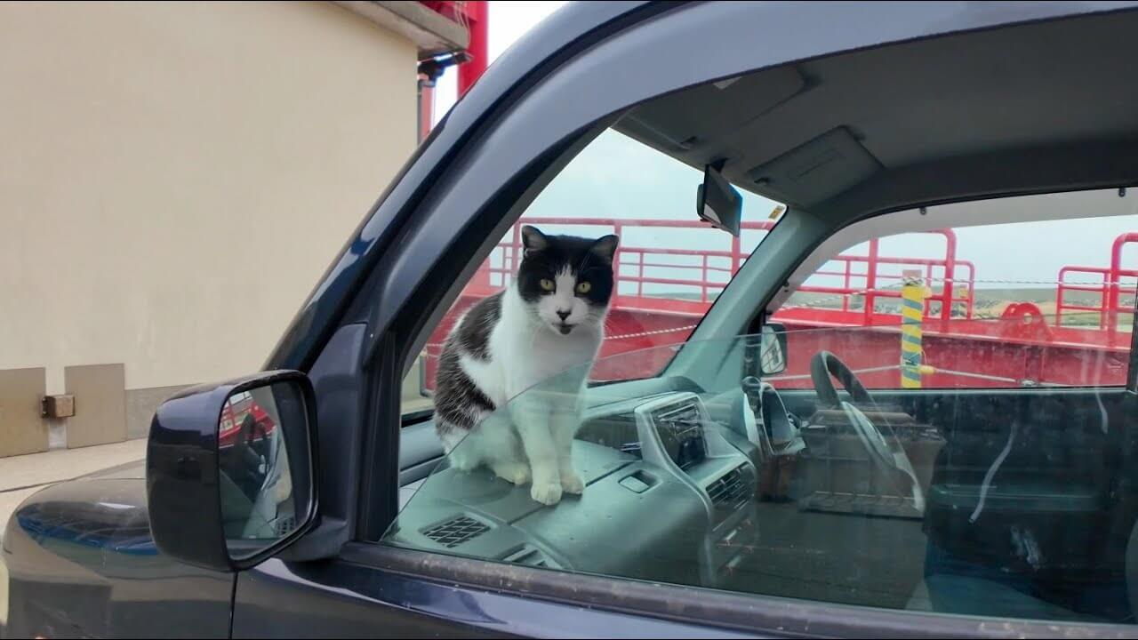 港に駐車してある車のなかにハチワレさんが座っていて、主さんのほうを見ながらあいさつをしてきてくれています。