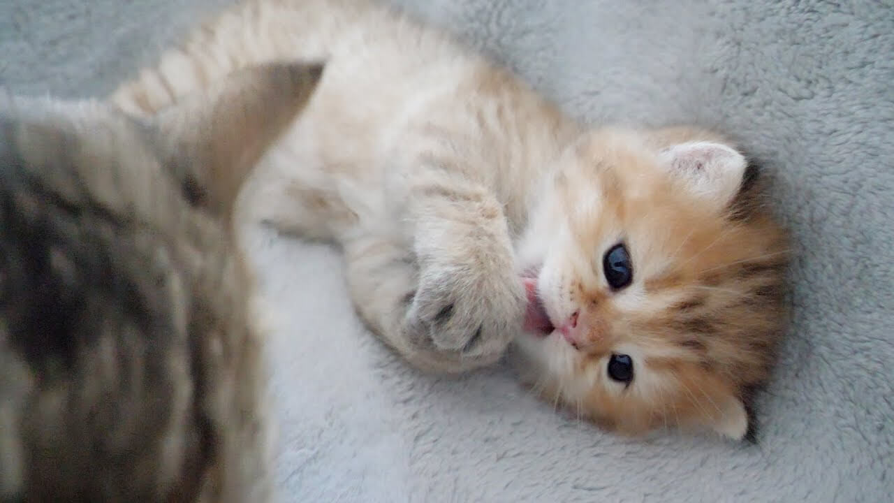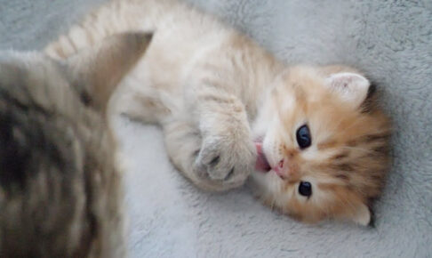 お母さん猫から毛づくろいされたくなくてブロックする子猫