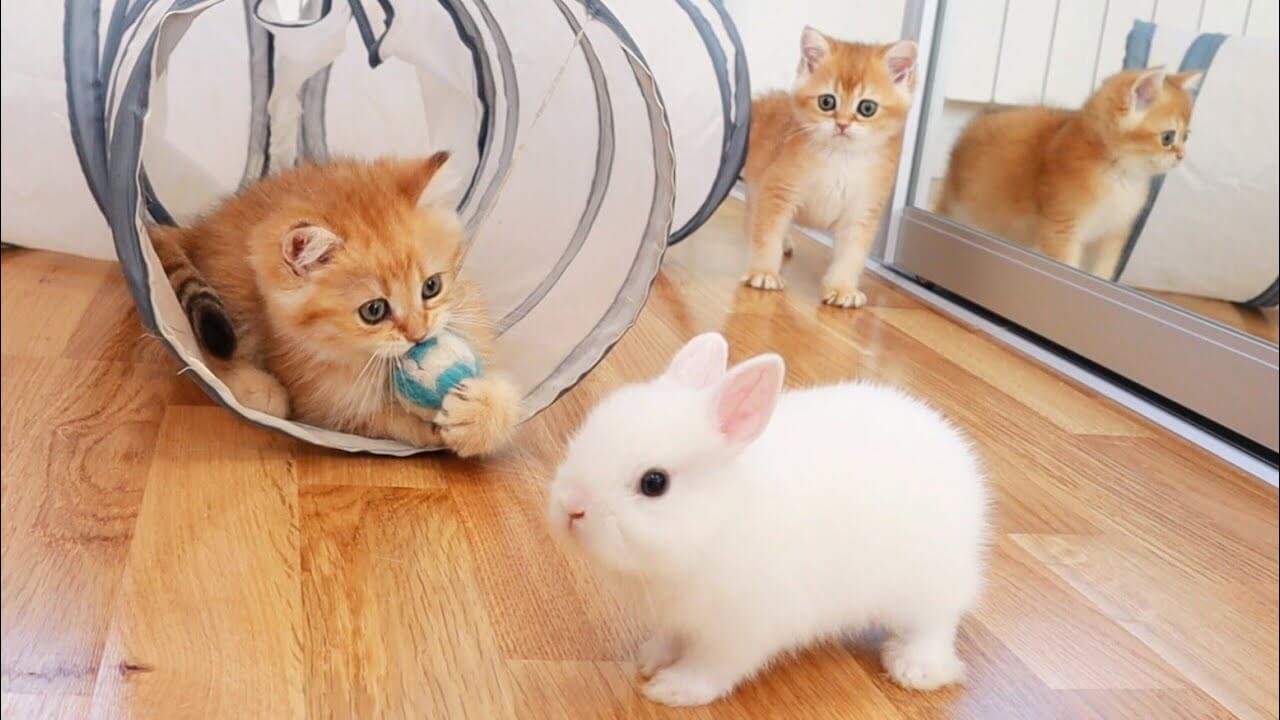 テンション爆上がりで遊び狂う子猫たちに子うさぎもドン引き!?