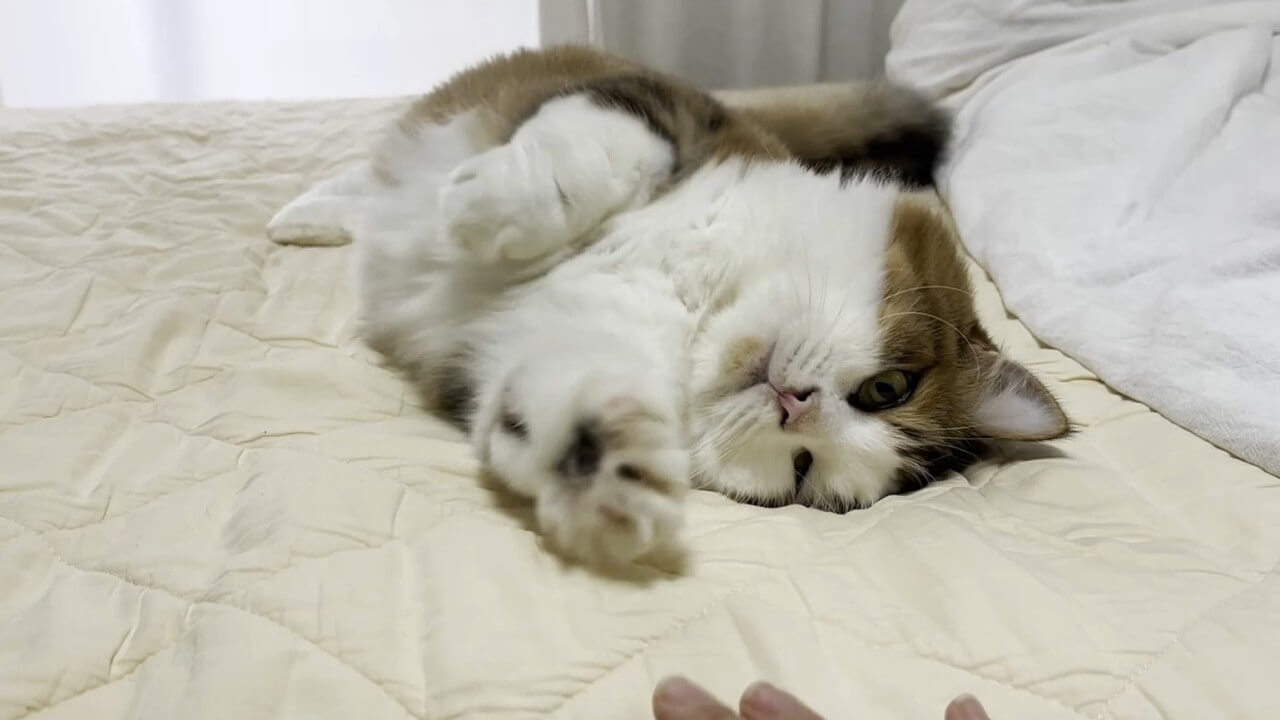 大好きなお母さんの香りがするベッドで、こんなふうにご機嫌でくつろぐのが秀吉の日々のルーティーン。こころから幸せを噛み締めているような感じがします。