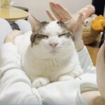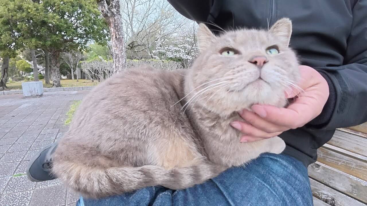 撮影者さんにベンチの上でアゴの下側を丁寧に撫でてもらってサバトラ猫さんが、体をくねらせて全身で喜びや楽しさを表現しているシーンが可愛かったです。
