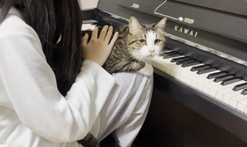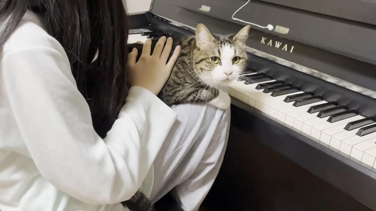 娘さんはピアノを弾こうと椅子に座ると、なんと愛猫オデコちゃんが膝上に乗ってきました。
